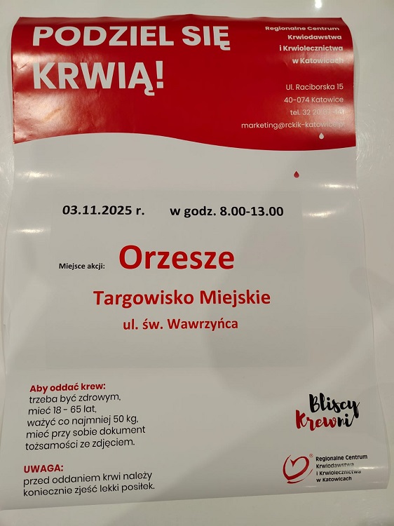 W poniedziałek, 3 listopada, w Orzeszu odbędzie się akcja honorowego krwiodawstwa. Ambulans Regionalnego Centrum Krwiodawstwa stanie na Targowisku Miejskim, ul. św. Wawrzyńca 13, w godz. 8:00–13:00.