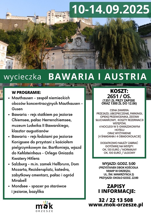 Miłośnicy podróży i historii będą mieli okazję we wrześniu uczestniczyć w wyjątkowej wycieczce do Bawarii i Austrii, organizowanej przez Miejski Ośrodek Kultury w Orzeszu. W programie przewidziano m.in. rejsy po malowniczych jeziorach, zwiedzanie zamków, pałaców, klasztorów i historycznych miast.