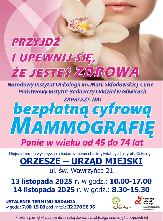 W czwartek, 13 listopada, mammobus będzie dostępny od godziny 10:00 do 17:00W piątek, 14 listopada, badania będą prowadzone od godziny 8:30 do 15:30Miejscem postoju mammobusu będzie teren przy Urzędzie Miejskim Orzesze.