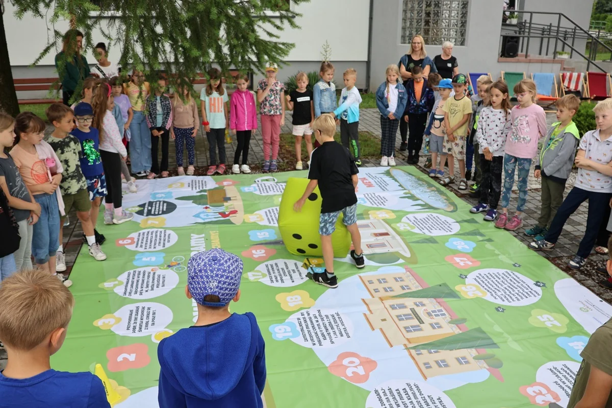 Zabawa edukacyjna przed Miejską Biblioteką Publiczną w Orzeszu
