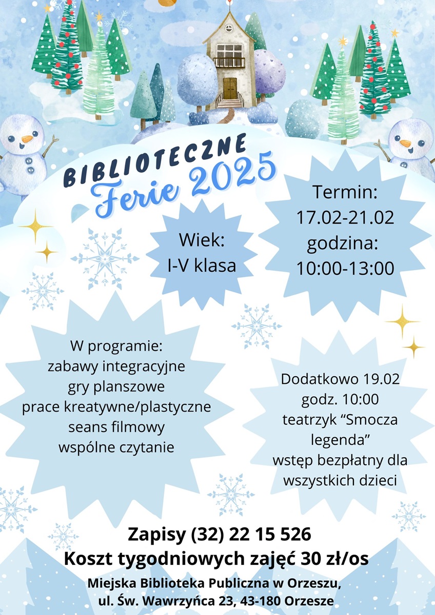 Miejska Biblioteka Publiczna w Orzeszu zaprasza na ferie. Zajęcia odbędą się od 17 do 21 lutego, w godz. 10-13 i są przeznaczone dla dzieci z klas I-V szkół podstawowych.