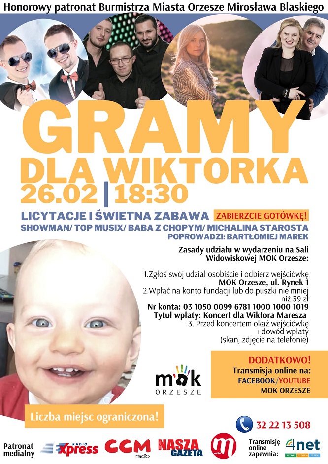 Miejski Osrodek Kultury w Orzeszu zaprasza na szczególny koncert “Gramy dla Wiktorka”. Dochód z wydarzenia zostanie przeznaczony na leczenie malucha!