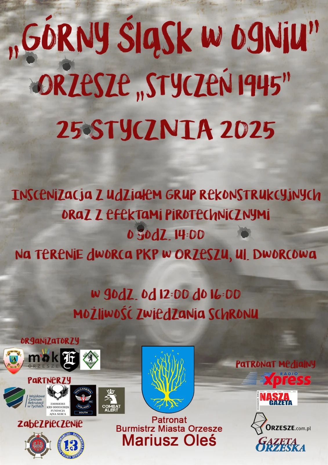 „Górny Śląsk w Ogniu”. Orzesze „Styczeń 1945” inscenizacja z udziałem grup rekonstrukcyjnych oraz efektami pirotechnicznymi odbędzie się 25 stycznia 2025r. Początek o godz. 14.00 (od godz. 12 do 16 będzie można zwiedzić schron).