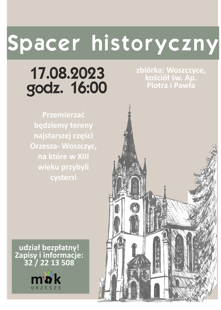 Miejski Ośrodek Kultury zaprasza wszystkich na spacer historyczny ulicami najstarszej części Orzesza, czyli Woszczycami. Uczestniczy, przemierzać będą tereny, na które w XIII wieku przybyli cystersi. Odwiedzą również nieistniejący już dziś przysiółek Widek, a spacer zakończy się wizytą w woszczyckim kościele parafialnym.