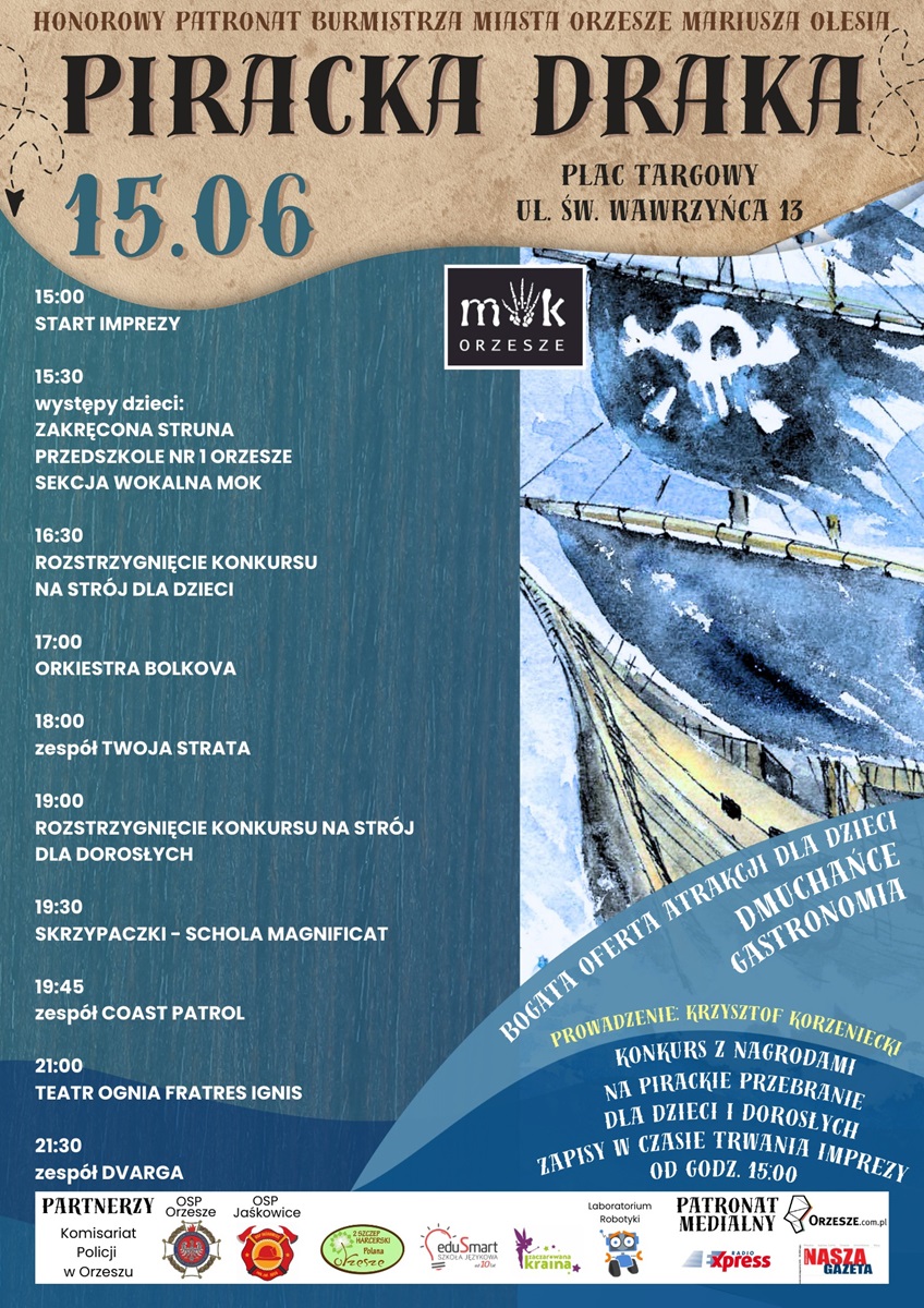 Mok zaprasza mieszkańców i nie tylko na niezapomnianą przygodę w Orzeszu! “Piracka Draka” to piknik rodzinny, który obfituje w emocje i zabawę dla każdego! Odkryjcie z nami piracki świat rozpoczynając od 15:00.