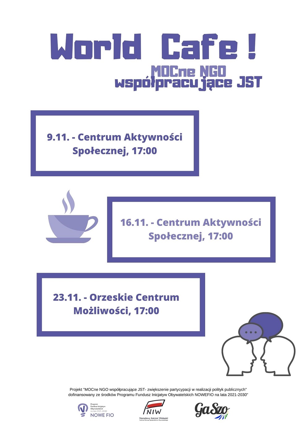 Fundacja GaSzo zaprasza przedstawicieli organizacji pozarządowych, lokalnego biznesu oraz samorządu do udziału w Kawiarenkach Obywatelskich.