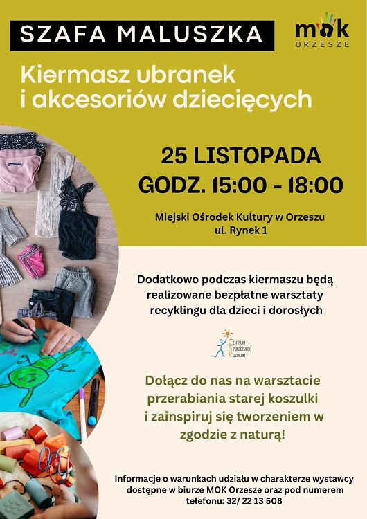 Już 25 listopada w Miejskim Ośrodku Kultury w Orzeszu odbędzie się wyjątkowe wydarzenie – kiermasz ubranek i akcesoriów dziecięcych. To doskonała okazja, by odświeżyć dziecięcą garderobę, znaleźć coś wyjątkowego w atrakcyjnej cenie, a przy okazji zadbać o środowisko.