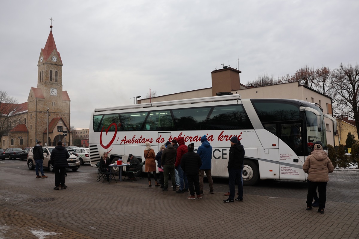 Kolejka chętnych do oddania krwi na Placu Targowym w Orzeszu