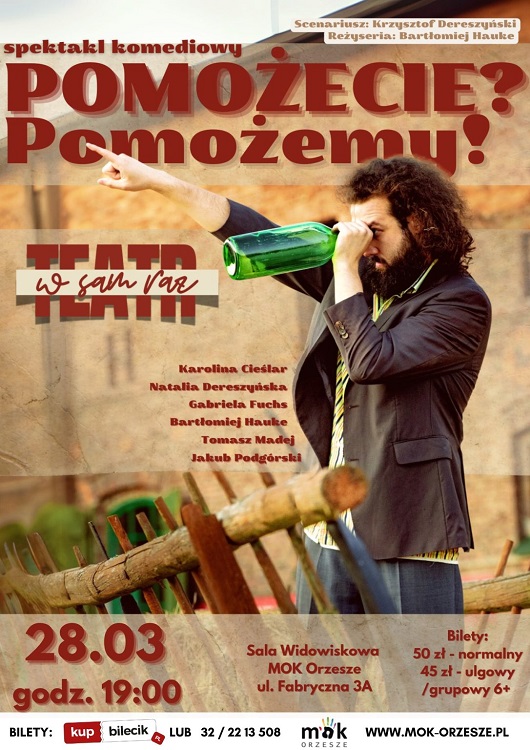 MOK Orzesze zaprasza na wyjątkowy spektakl komediowy „Pomożecie? Pomożemy!”, który odbędzie się 28 marca o godz. 19:00 w Sali Widowiskowej Miejskiego Ośrodka Kultury w Orzeszu. To idealna okazja, by oderwać się od codzienności i zanurzyć w pełnej humoru satyrze na temat absurdów władzy i życia mieszkańców wsi.