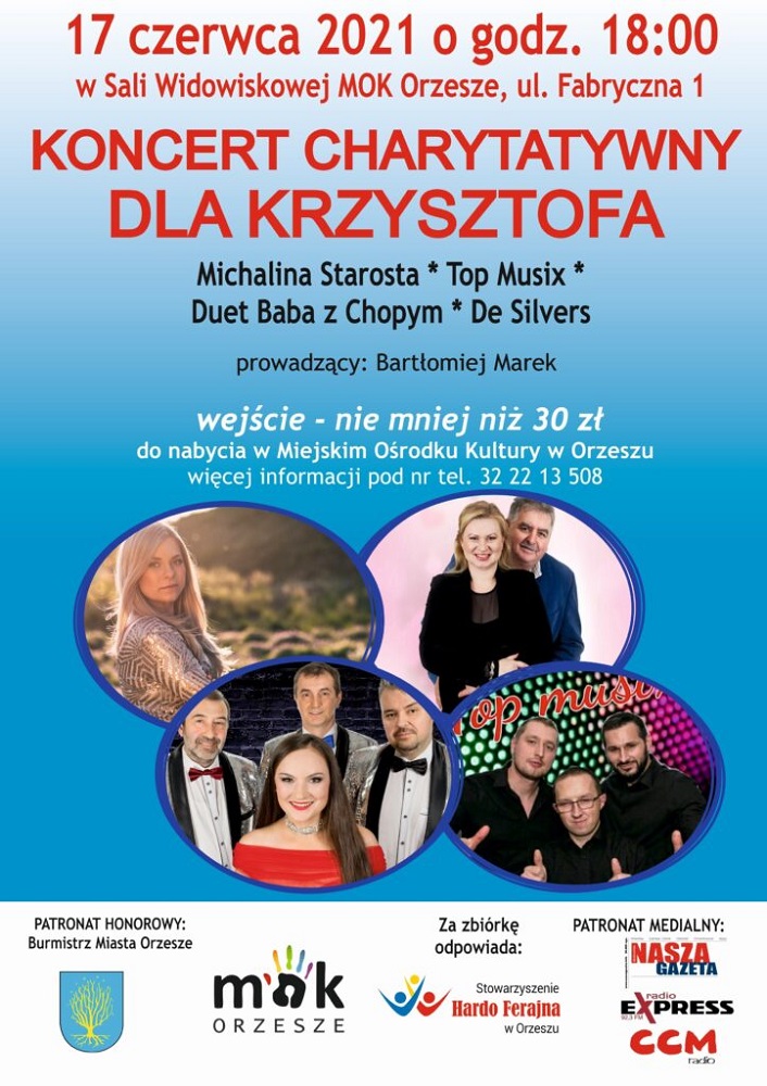 Miejski Ośrodek Kultury wraca z Koncertem Charytatywnym dla Krzysztofa. Odbędzie się 17 czerwca o godzinie 18:00 w Sali Widowiskowej MOK Orzesze.