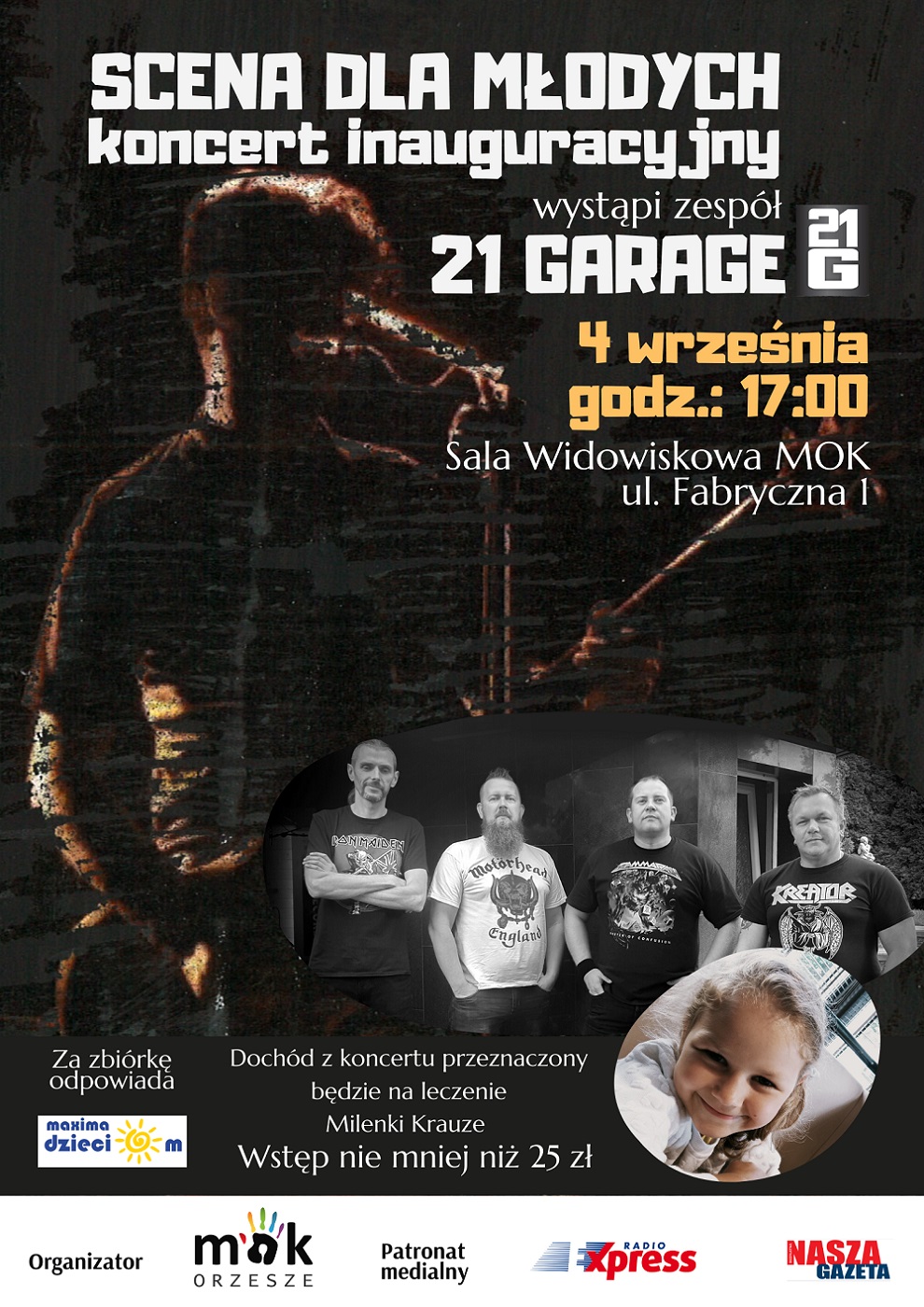 4 września w Sali Widowiskowej MOK Orzesze wystąpi zespół 21 Garage. Będzie to koncert inauguracyjny projektu “Scena dla młodych”. Koncert ma charakter charytatywny, dochód ze sprzedaży biletów zostanie przekazany na leczenie Milenki Krauze.