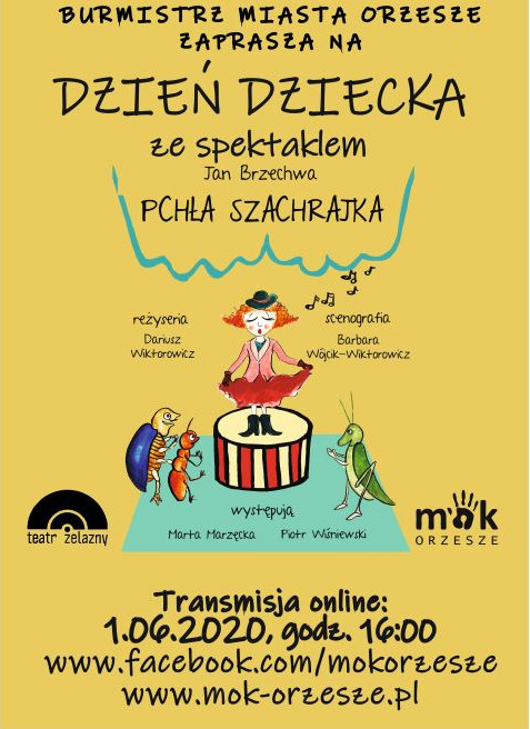 Zatem, 1 czerwca o godzinie 16:00 usiądźcie wygodnie w swoim ulubionym fotelu i zajrzyjcie na stronę www oraz facebook Miejskiego Ośrodka Kultury w Orzeszu. Tam będziecie mogli połączyć się bohaterką tego widowiska – Pchłą Szachrajką i jej towarzyszami, którzy specjalnie wystąpią dla Was na scenie Sali Widowiskowej.