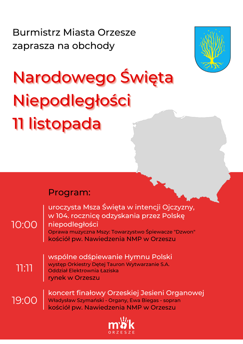Uroczysta msza święta w intencji ojczyzny, w 104 rocznicę odzyskania przez Polskę niepodległości odbędzie się 11 listopada o godz. 10 w kościele pw. Nawiedzenia NMP w Orzeszu. O godz. 11.11 na rynku nastąpi wspólne odśpiewanie hymnu Polski i wystąpi Orkiestra Dęta Tauron Wytwarzanie S.A.