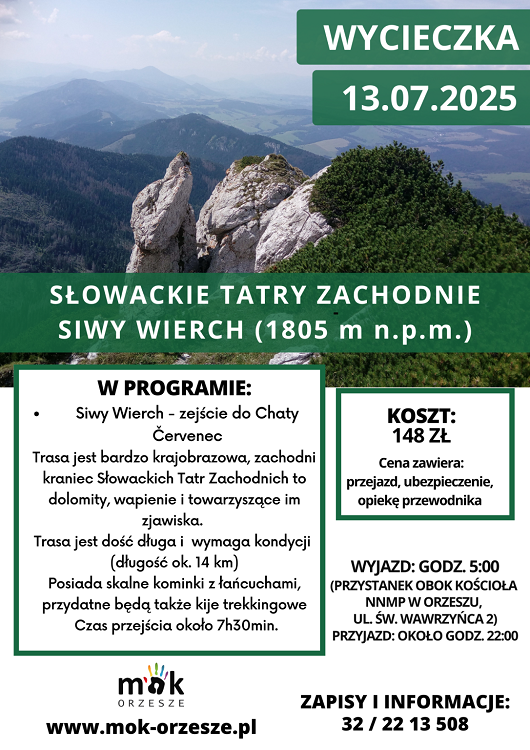 Miejski Ośrodek Kultury w Orzeszu zaprasza na kolejną wycieczkę w góry. Tym razem uczestnicy będą mieli okazję zdobyć Siwy Wierch (1805 m n.p.m.) – jeden z najbardziej malowniczych szczytów słowackich Tatr Zachodnich.