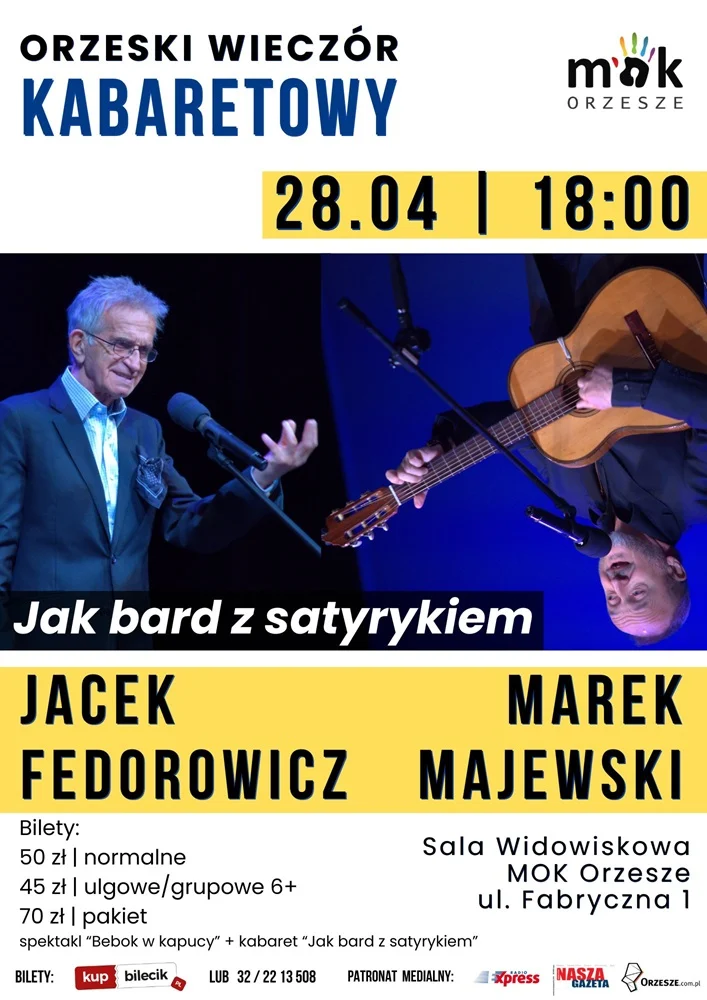 MOK Orzesze zaprasza na nadchodzący Orzeski Wieczór Kabaretowy. Tym razem gościem będzie ikonę polskiej sceny rozrywkowej – Jacek Fedorowicz, oraz wszechstronny artysta – Mark Majewski. Obydwaj artyści wystąpią w programie „Jak bard z satyrykiem”, który z pewnością dostarczy widzom niezapomnianych wrażeń.