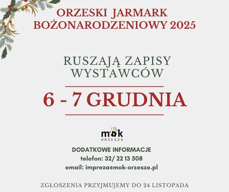 Miejski Ośrodek Kultury w Orzeszu ogłasza rozpoczęcie zapisów dla wystawców na tegoroczny Orzeski Jarmark Bożonarodzeniowy. Wydarzenie odbędzie się w dniach 6-7 grudnia, a zgłoszenia przyjmowane są do 24 listopada. Liczba miejsc jest ograniczona, dlatego zachęcamy do szybkiej rejestracji.