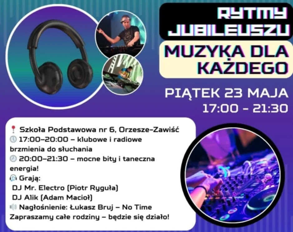 Od godziny 17:00 rozpoczną się występy uczniów w sali gimnastycznej oraz muzyczne brzmienia, które na pewno przypadną do gustu wszystkim uczestnikom. Do tańca i słuchania zapraszają DJ Mr. Electro (Piotr Ryguła), DJ Alik (Adam Macioł) oraz Łukasz Bruj – No Time, zapewniający nagłośnienie.