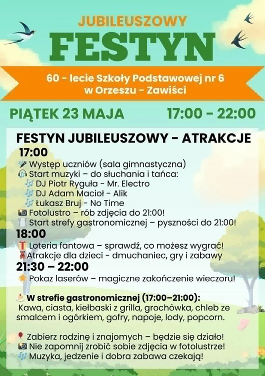 Szkoła Podstawowa nr 6 im. Alfreda Szklarskiego w Orzeszu-Zawiści zaprasza na wyjątkowy Jubileuszowy Festyn, który odbędzie się w piątek, 23 maja, w godzinach 17:00–22:00. Z okazji 60-lecia placówki przygotowano bogaty program atrakcji dla mieszkańców i rodzin z całego miasta.