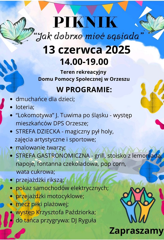 Już 13 czerwca w Orzeszu odbędzie się wyjątkowy piknik pod hasłem „Jak dobrze mieć sąsiada”. To doskonała okazja, by spędzić czas w towarzystwie przyjaciół, sąsiadów i mieszkańców miasta. Wydarzenie odbędzie się na terenie rekreacyjnym Domu Pomocy Społecznej w Orzeszu w godzinach 14:00-19:00.