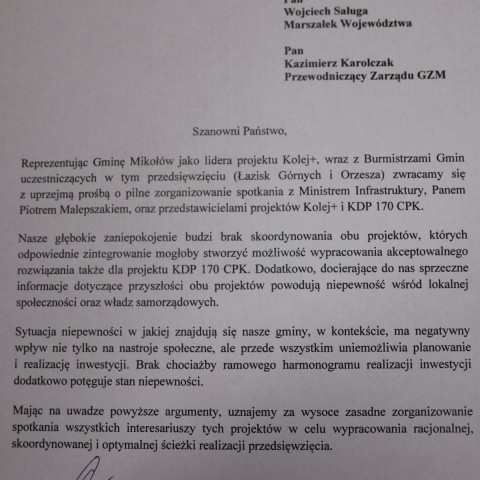 Mariusz Oleś, burmistrz Orzesza podpisał pismo do Wojciecha Saługi, marszałka województwa śląskiego oraz Kazimierza Karolczaka, przewodniczącego zarządu GZM z prośbą o zorganizowanie spotkania z Piotrem Malepszakiem, ministrem infrastruktury oraz przedstawicielami projektów Kolej+ i KDP 170 CPK.