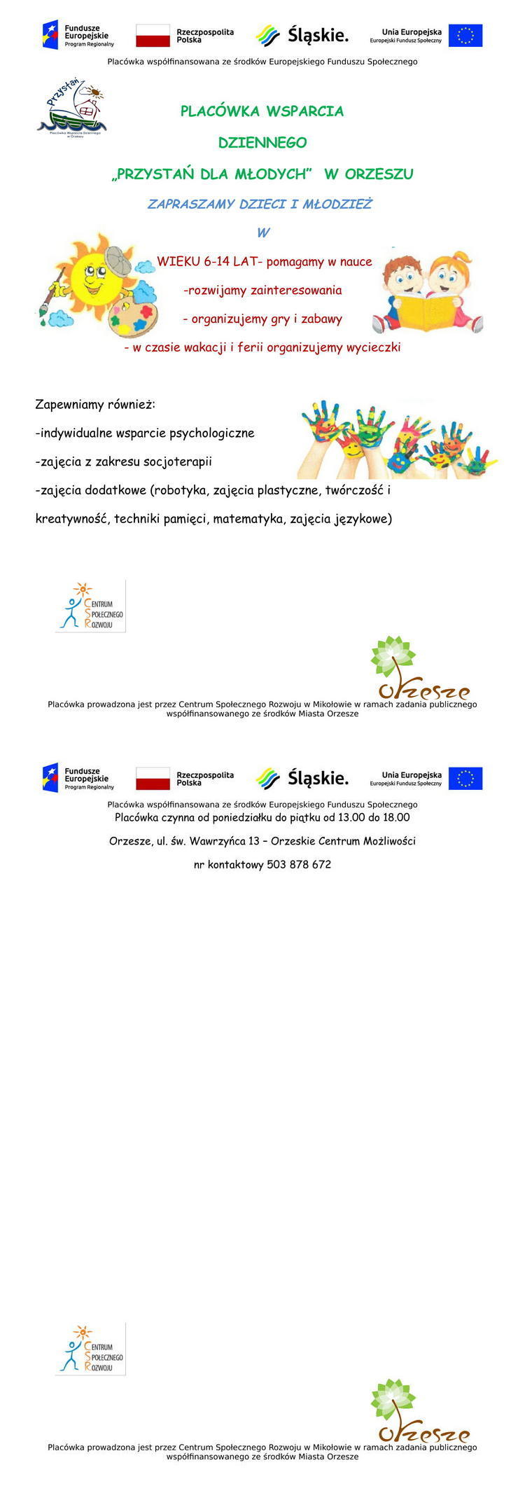 Placówka wsparcia dziennego “Przystań dla młodych” w Orzeszu zaprasza na zajęcia dzieci w wieku od 6 do 14 lat.