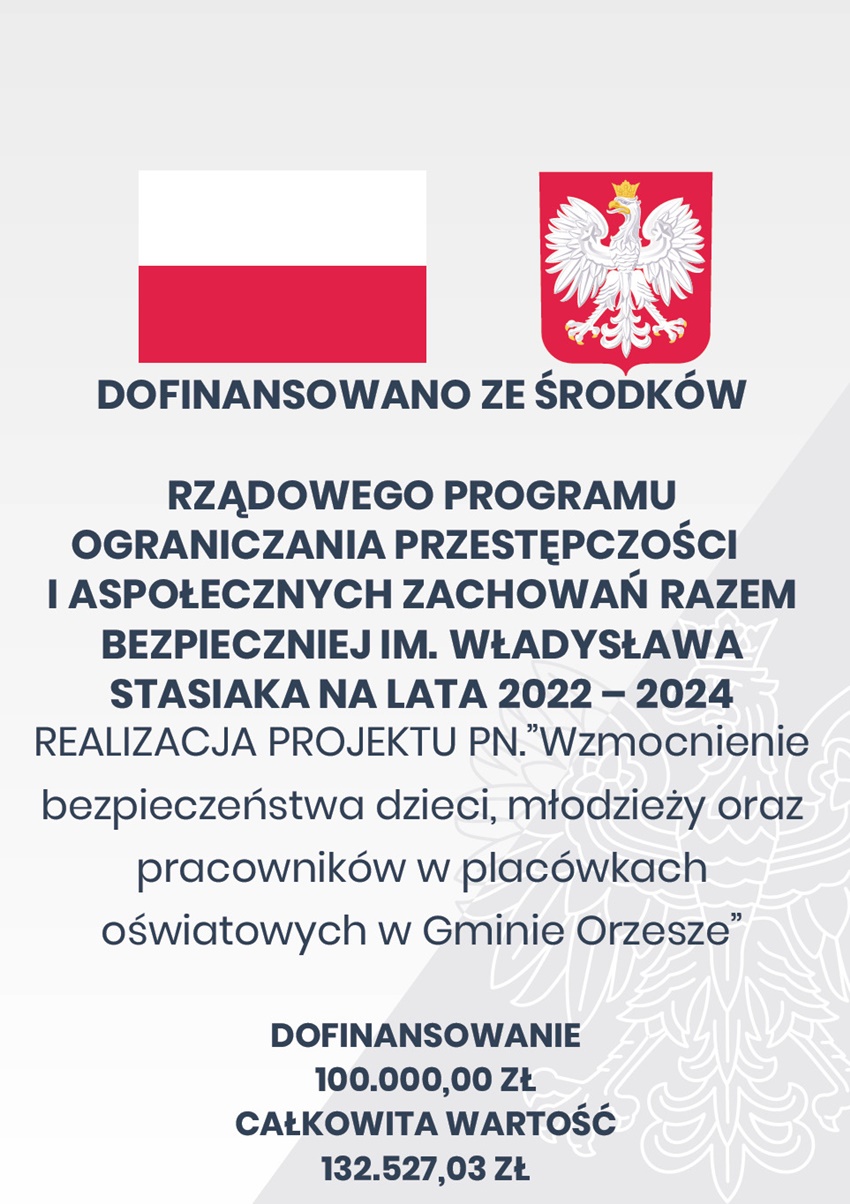 Dzięki 100 tys. zł dofinansowania ze środków “Rządowego programu ograniczania przestępczości i aspołecznych zachowań Razem bezpieczniej im. Władysława Stasiaka na lata 2022-2024” w Orzeszu zostanie zrealizowany projekt pn.: “Wzmocnienie bezpieczeństwa dzieci, młodzieży oraz pracowników w placówkach oświatowych w Gminie Orzesze”.
