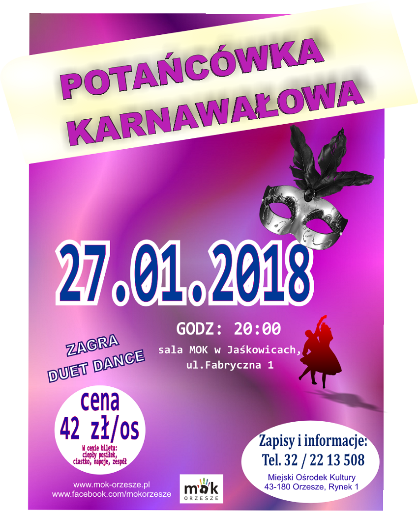 Miejski Ośrodek Kultury zaprasza na Potańcówkę Karnawałową, która odbędzie się 27 stycznia 2018 r., o godz. 20.00 w sali widowiskowej MOK w Jaśkowicach.
