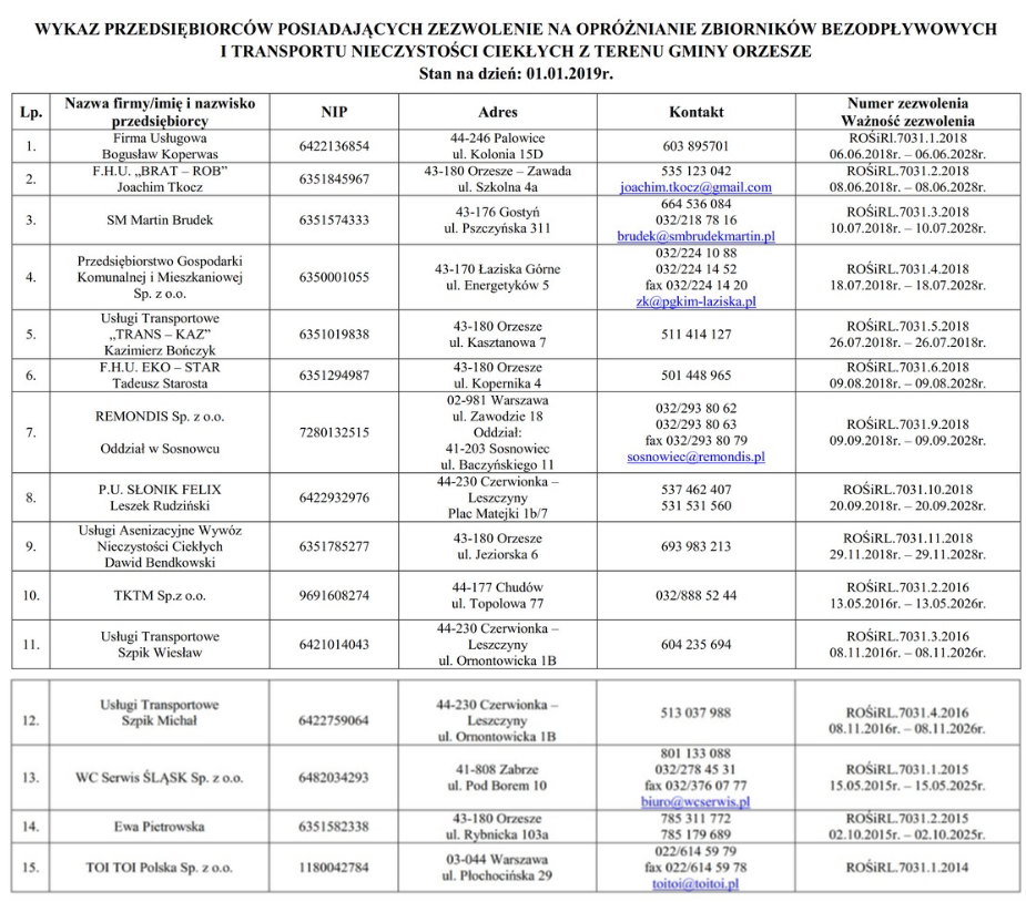 Zachęcamy do zapoznania się z wykazem przedsiębiorców posiadających zezwolenie na opróżnianie zbiorników bezodpływowych i transportu nieczystości ciekłych z terenu Gminy Orzesze.