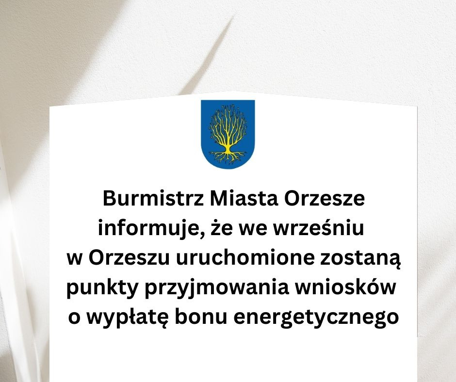 Burmistrz Miasta Orzesze informuje, że we wrześniu w Orzeszu uruchomione zostaną punkty przyjmowania wniosków o wypłatę bonu energetycznego.