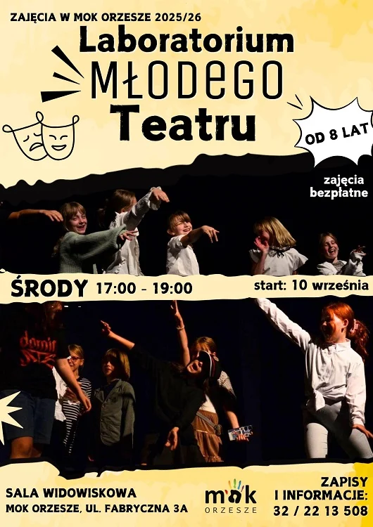 Miejski Ośrodek Kultury w Orzeszu rusza z zapisami na zajęcia stałe! Już 10 września wystartuje Laboratorium Młodego Teatru – wyjątkowa propozycja dla dzieci, które chcą rozwijać swoje umiejętności aktorskie.