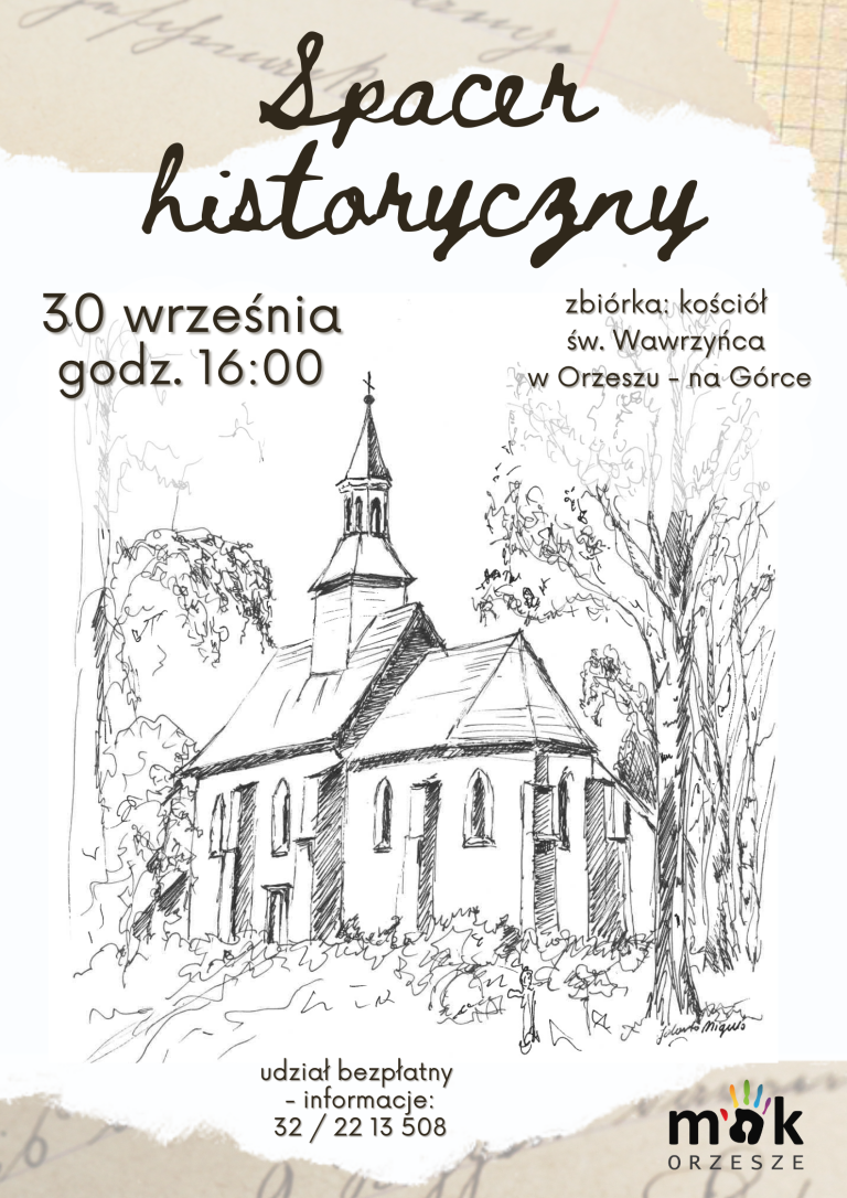 Już 30 września odbędzie się kolejny spacer historyczny – tym razem spotkamy się o godz. 16:00 przy kościele św. Wawrzyńca w Orzeszu – czyli pod dobrze wszystkim znanym kościółkiem na Górce