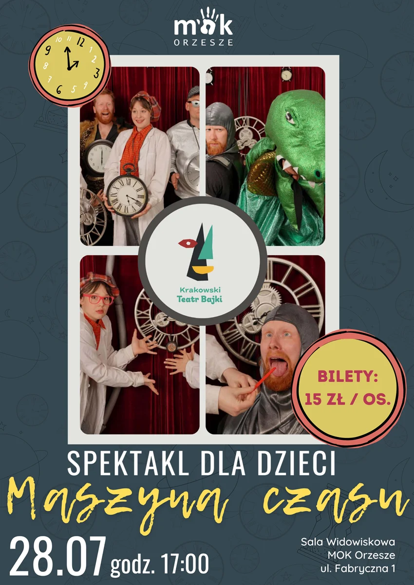 Miejski Ośrodek Kultury w Orzeszu zaprasza na spektakl „Maszyna czasu” w wykonaniu Krakowskiego Teatru Bajki, który odbędzie się 28 lipca o godz. 17:00 w Sali Widowiskowej MOK-u przy ul. Fabrycznej 1!