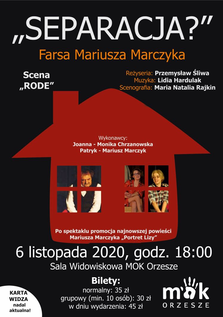 Miejski Ośrodek Kultury w Orzeszu ma przyjemność zaprosić na zbliżający się spektakl teatralny pt. “Separacja” w reż. Przemysława Śliwy, który odbędzie się 6 listopada o godz. 18:00.