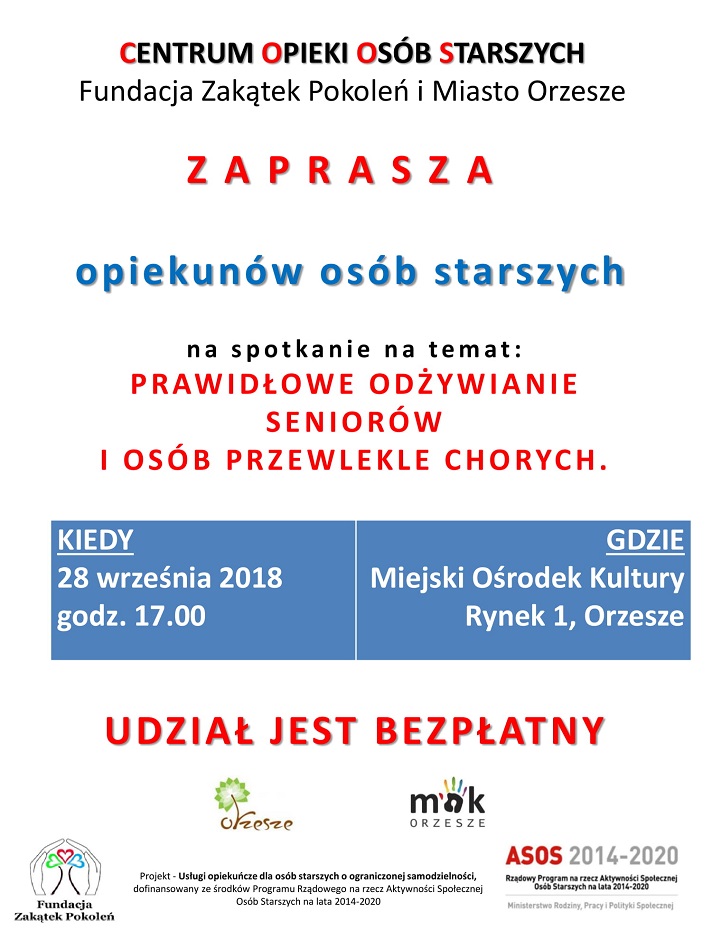 Centrum Opieki Osób Starszych Fundacja Zakątek Pokoleń zaprasza opiekunów osób starszych na spotkanie na temat prawidłowego odżywiania seniorów i osób przewlekle chorych.