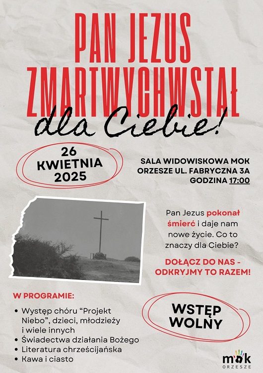 26 kwietnia o godz. 17:00 w Sali Widowiskowej MOK Orzesze przy ul. Fabrycznej 3A odbędzie się wyjątkowe wydarzenie o duchowym charakterze. Spotkanie pod hasłem „Pan Jezus zmartwychwstał dla Ciebie” to propozycja dla wszystkich, którzy pragną zatrzymać się na chwilę refleksji, wspólnego świętowania oraz doświadczenia żywej wspólnoty.
