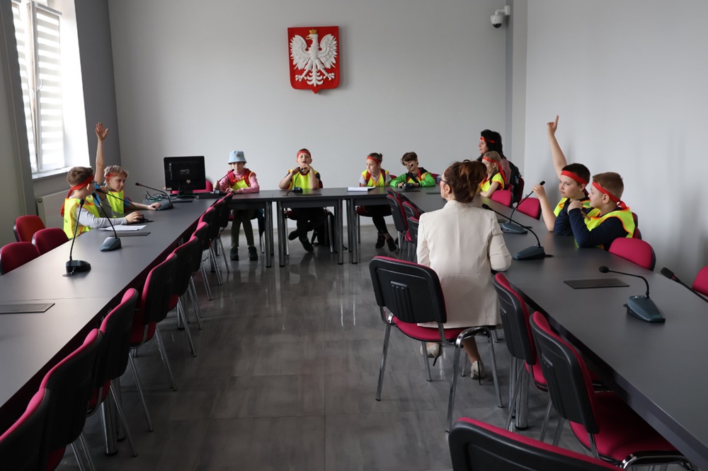 Uczniowie biorący udział w grze miejskiej odwiedzili Urząd Miasta Orzesze
