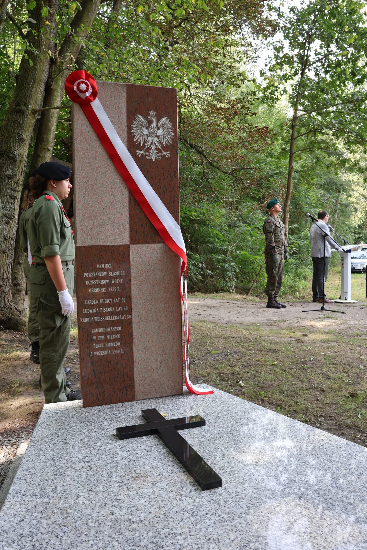 - Dyrektor Szkoły Podstawowej nr 6 im. Alfreda Szklarskiego w Orzeszu-Zawiści – pani Adriana Pustelny wraz z delegacją uczniów, Harcerze 2 Szczepu Harcerskiego „Polana” Hufca ZHP Ziemi Mikołowskiej oraz potomkowie Ludwika Pisarka, Karola Kubicy i Karola Weishelera.