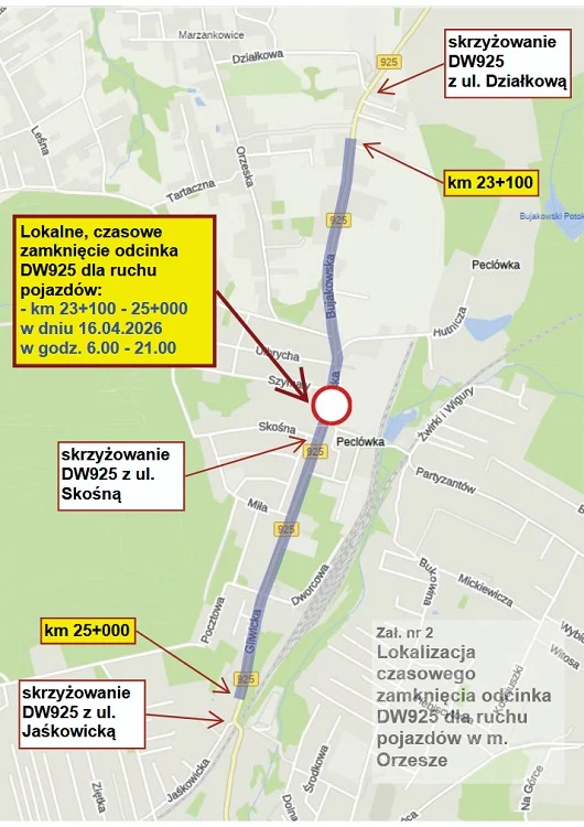 Całkowite zamknięcie DW925 w Orzeszu – 16 kwietnia