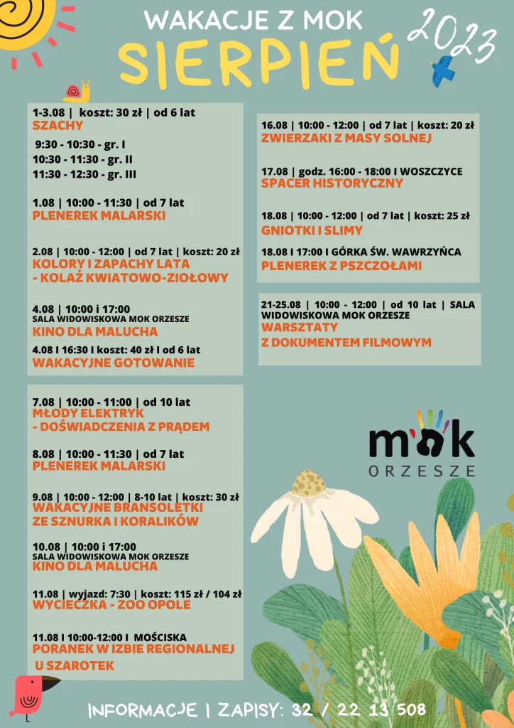 Z wszystkich warsztatów oraz spotkań, będzie można skorzystać do 25 sierpnia. W repertuarze znajdziecie m.in. warsztaty artystyczne, wycieczki oraz gry i zabawy dla najmłodszych. O szczegółowe informacje odnośnie wydarzenia, można zapytać, dzwoniąc po numer: 32/ 22 13 508.