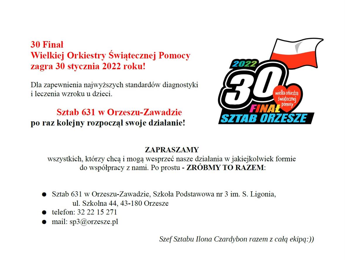 Sztab 631 Wielkiej Orkiestry Świątecznej Pomocy w Orzeszu-Zawadzie zaprasza do współpracy wszystkich, którzy chcą i mogą wesprzeć ich działania.