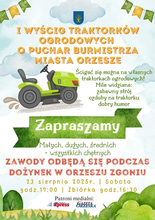 W sobotę, 23 sierpnia w Orzeszu odbędzie się Wyścig Traktorków Ogrodowych o Puchar Burmistrza Miasta Orzesze. Jest to wyjątkowa okazja, aby spędzić czas w gronie rodziny i przyjaciół, biorąc udział w rywalizacji na własnych traktorkach ogrodowych. Burmistrz serdecznie zaprasza do wzięcia udziału wszystkich chętnych, niezależnie od wieku – od dzieci po dorosłych.