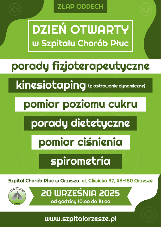 Szpital Chorób Płuc w Orzeszu zaprasza na Dzień Otwarty, który ma na celu promowanie profilaktyki i zdrowia. To doskonała okazja, by przeprowadzić ważne badania, skorzystać z porad specjalistów i zadbać o swoje płuca. Nie czekaj na niepokojące objawy – skontroluj swoje zdrowie już teraz!