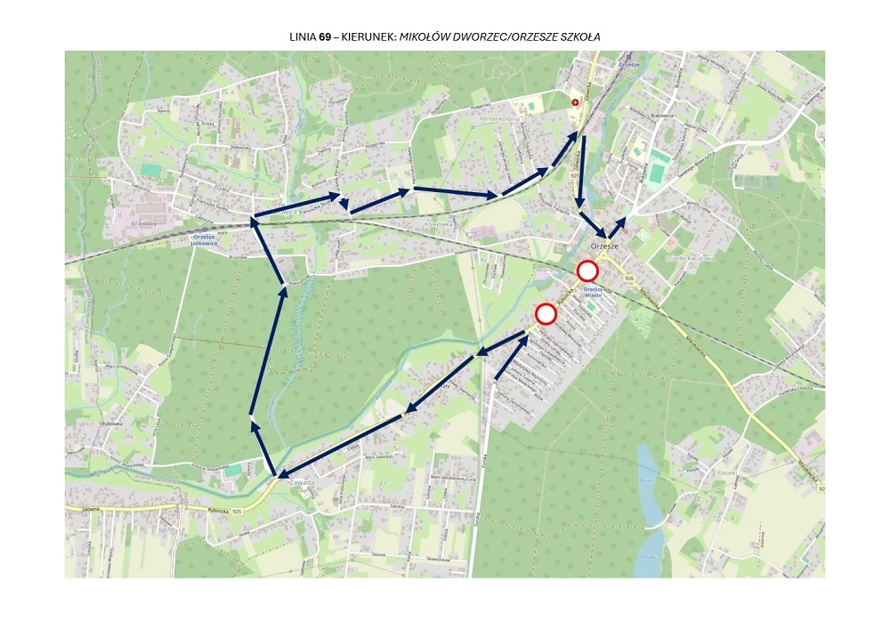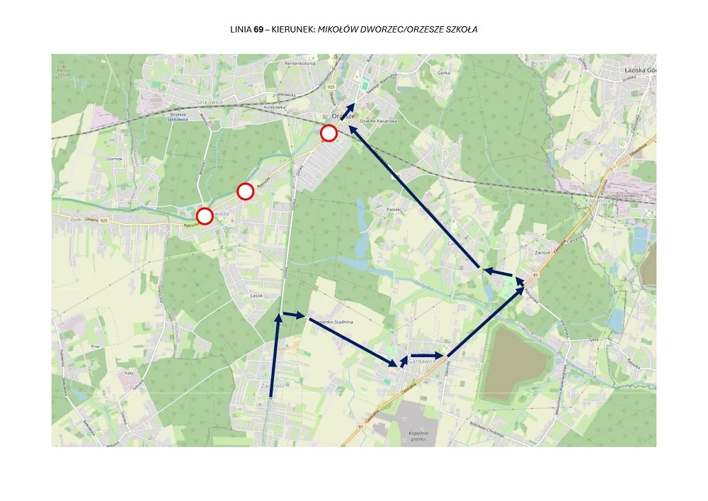 4 sierpnia (poniedziałek) autobus linii 69 w kierunku przystanku ŻoryCentrum Przesiadkowe po obsłudze przystanku Orzesze Kościół zostanie skierowany trasą objazdową przez ul. Mikołowską, Centralną (DK81),Katowicką, Wojska Polskiego, Żorską i włączy się na stałą trasę na przystanku Zazdrość Las.Natomiast w kierunku przystanku Mikołów Dworzec/Orzesze Szkoła autobus po obsłudze przystanku Zazdrość Las pojedzie przez ul. Żorską, Wojska Polskiego, Katowicką, Centralną (DK 81), Mikołowską i włączy się na stałą trasę na przystanku Orzesze Kościół.