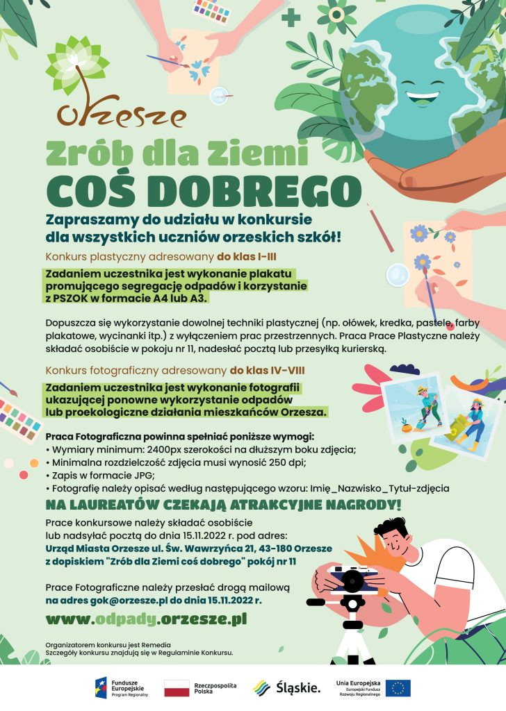 Konkurs plastyczny jest adresowany do uczniów klas I-III i polega na wykonaniu plakatu w formie A4 lub A3 promującego segregację odpadów i korzystanie z PSZOK. Konkurs fotograficzny przeznaczony jest dla uczniów klas IV-VIII. Zadaniem uczestnika jest zrobienie zdjęcia pokazującego ponowne wykorzystanie odpadów lub proekologiczne działanie mieszkańców Orzesza. Szczegóły konkursów znajdują się na plakacie.
