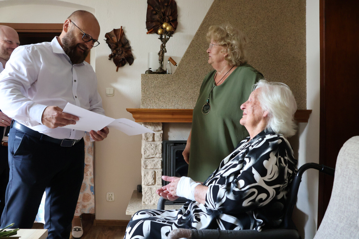 Pani Anna Czardybon z Orzesza Zgonia 23 lipca obchodzi 100. urodziny. Burmistrz Orzesza i jego zastępca osobiście złożyli jej życzenia.