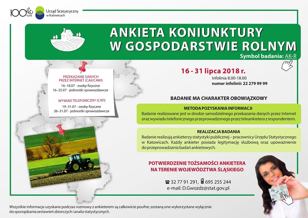 Urząd Statystyczny w Katowicach informuje o badaniu ankietowym w gospodarstwach rolnych o symbolu AK-R (Ankieta koniunktury w gospodarstwie rolnym) przeprowadzanym w dniach 16 - 31 lipca 2018 r.
