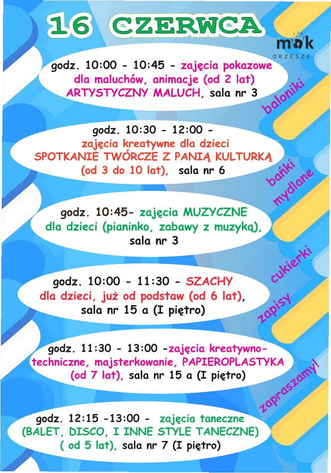 W tym dniu MOK przedstawi propozycję działań na nadchodzący rok edukacyjny, to doskonała okazja, by poznać wszystkie propozycje różnych zajęć dla dzieci w różnym wieku.