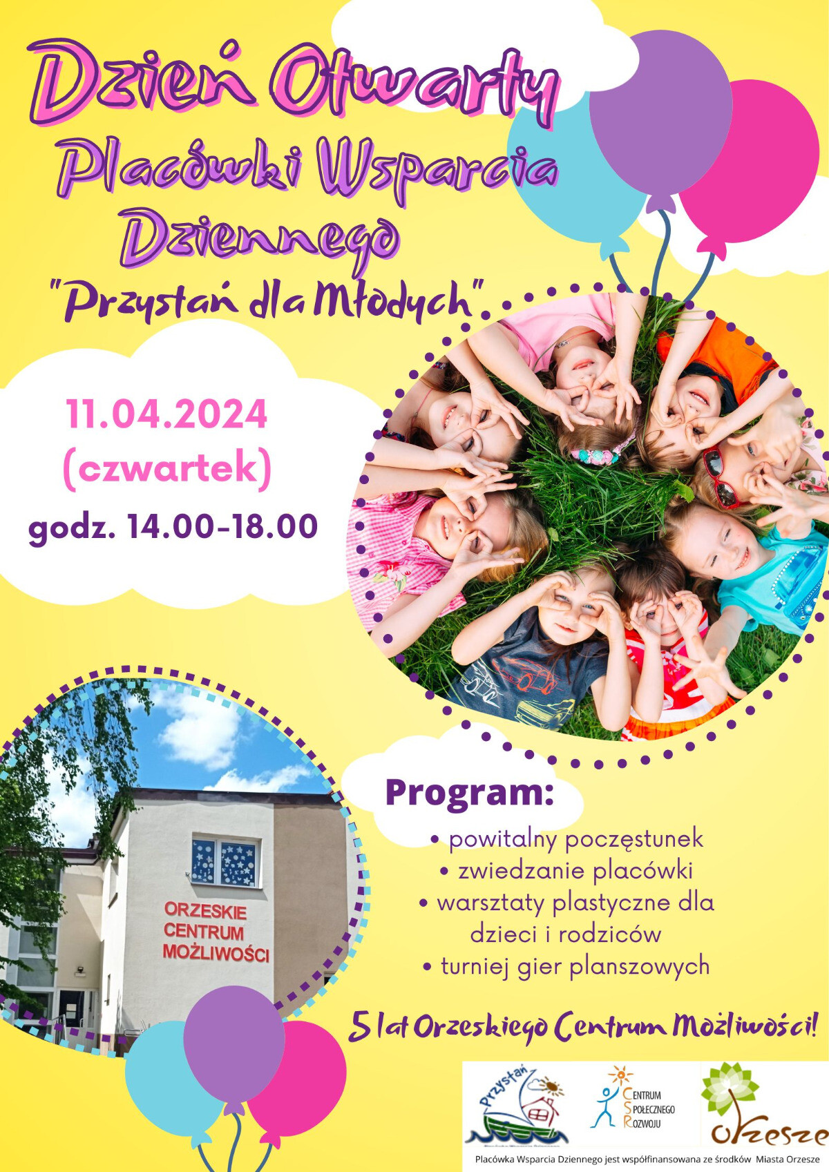 Dzień otwarty Placówki Wsparcia Dziennego „Przystań dla Młodych” odbędzie się 11 kwietnia 2024 roku w godz. 14-18. W programie: powitalny poczęstunek, zwiedzanie placówki, warsztaty plastyczne dla dzieci i rodziców, turniej gier planszowych.