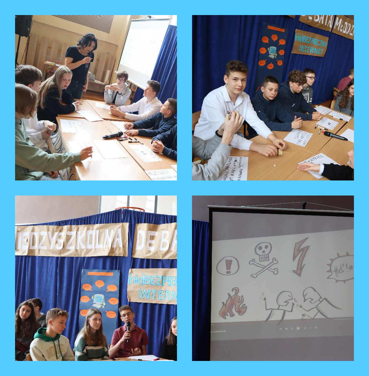 Potem odbyła się debata. Część uczniów przedstawiła argumenty za tym, że korzystanie z sieci może być niebezpieczne, a pozostali mówili o korzyściach płynących z dostępu do internetu. Padły argumenty związane z ogromnymi możliwościami, jakie daje internet w obszarze np. nauki, rozrywki, pracy czy nawiązywania znajomości, a z drugiej strony młodzież mówiła np. o hejcie, wyłudzaniu danych, cyberprzemocy i rozpadzie relacji koleżeńskich, a nawet wynikającej stąd depresji. Uczniowie dyskutowali ze sobą, przekonywali się nawzajem, nie pozostawiali kontrargumentów bez odpowiedzi. Publiczność aktywnie włączała się w dyskusję. Świadczy to o wadze podjętego tematu i poważnym potraktowaniu go przez młodzież.