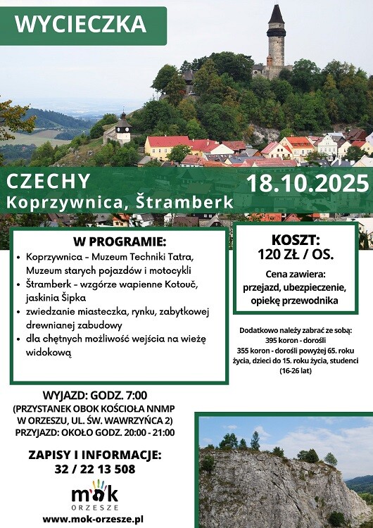 Wyjazd zaplanowano na godzinę 7:00 z przystanku obok kościoła NNMP w Orzeszu (ul. Św. Wawrzyńca 2), a powrót przewidywany jest między 20:00 a 21:00. Podczas wycieczki uczestnicy odwiedzą Koprzywnicę, gdzie będą mieli okazję zwiedzić Muzeum Techniki Tatra oraz Muzeum Starych Pojazdów i Motocykli. Kolejnym punktem programu będzie Štramberk, słynący z wzgórza wapiennego Kotouč, jaskini Šipka oraz zabytkowej drewnianej zabudowy. Dla chętnych przewidziana jest możliwość wejścia na wieżę widokową, z której rozciąga się przepiękna panorama okolicy.